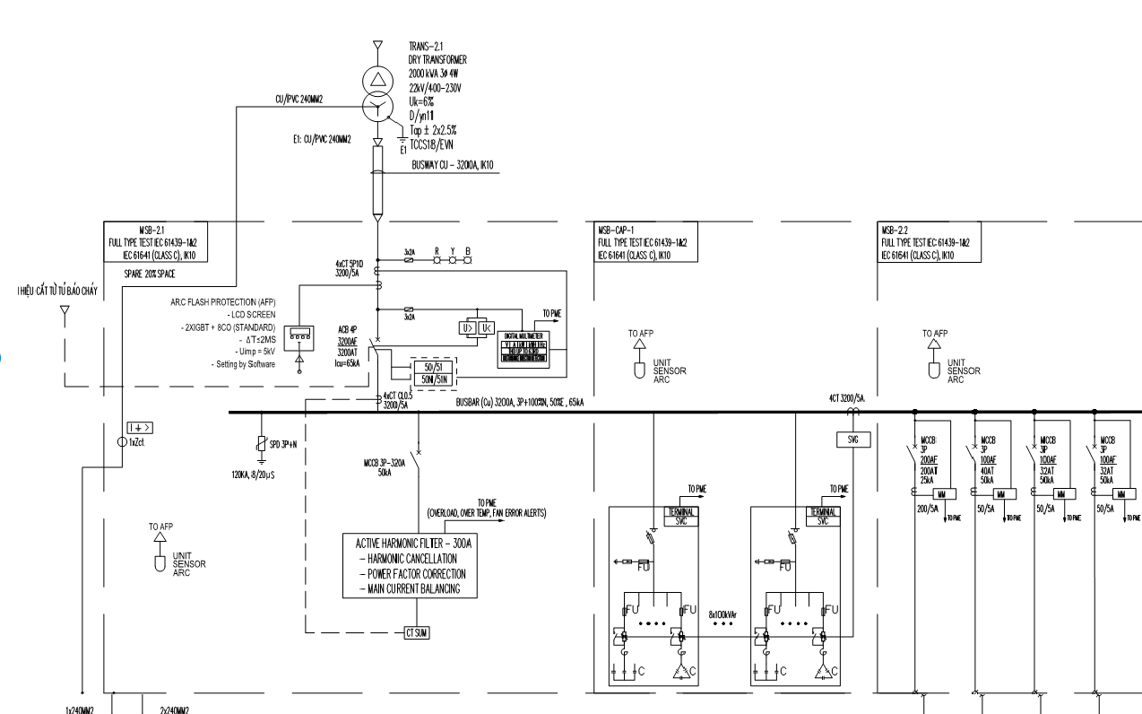 Bộ bản vẽ gồm 2 bản vẽ: 1 bản cad và 1 bản PDF về hệ thống lọc sóng hài chủ động được thiết kế cùng với sơ đồ điện tổng